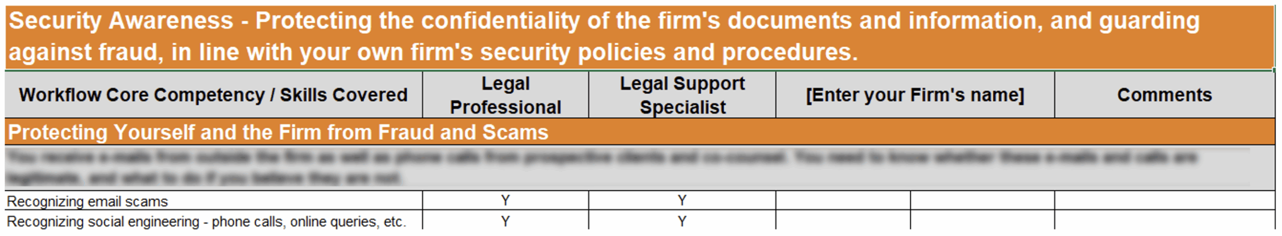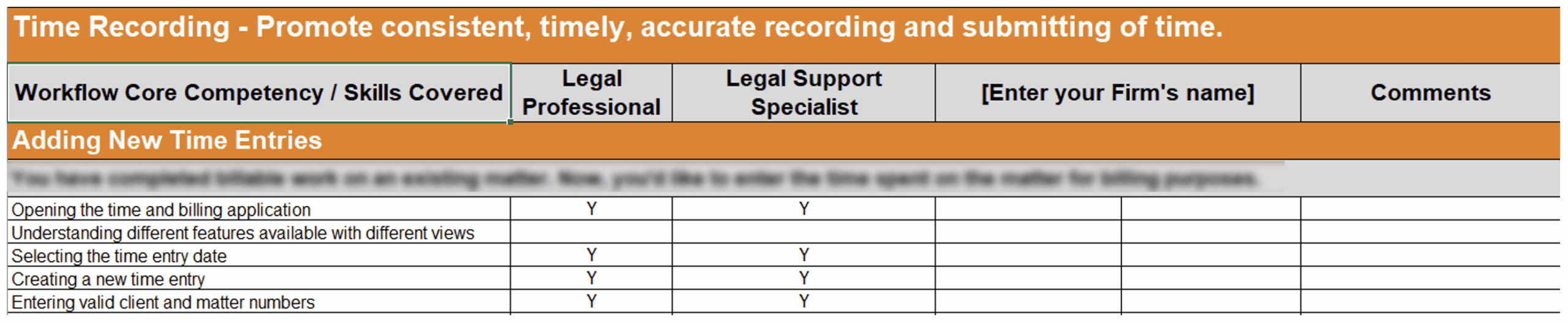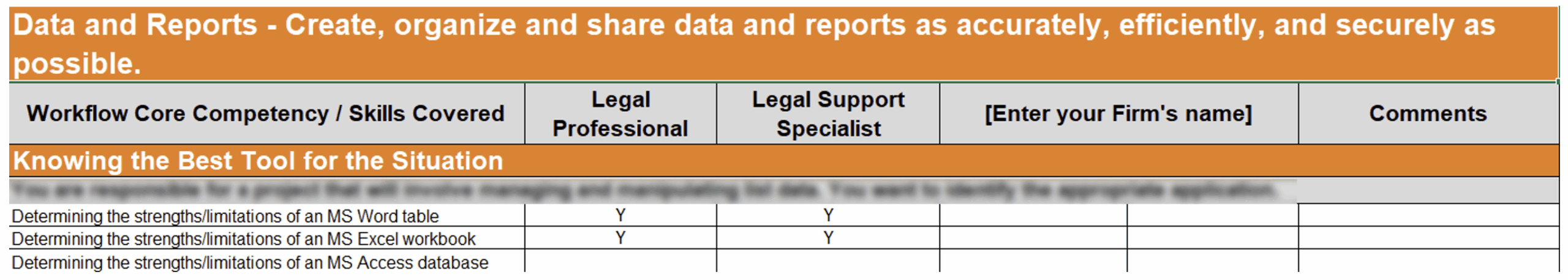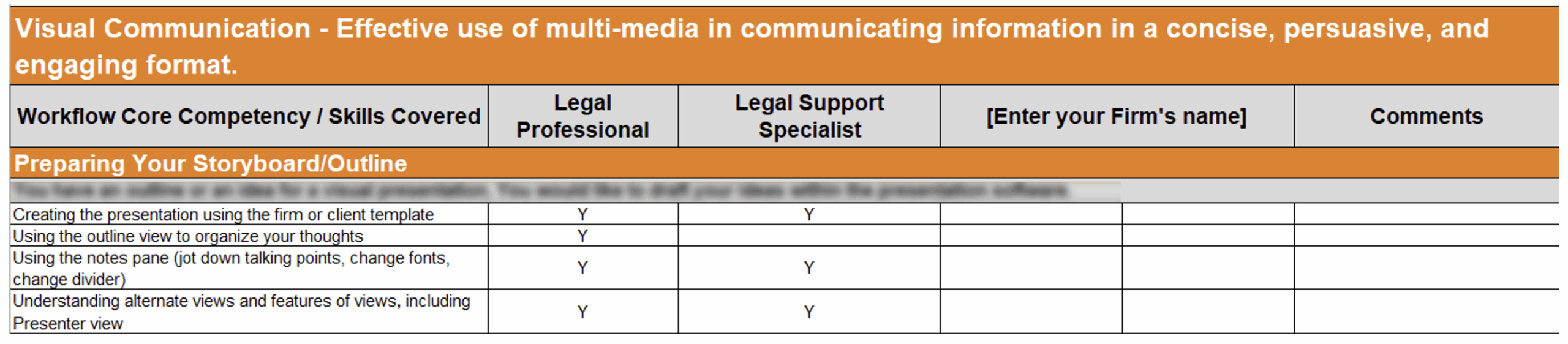 Each core competency contains two distinct paths: one defining attorney (or billable staff) core competencies and one defining the core competencies for support staff, addressing the specific needs of these two important levels of your organization.